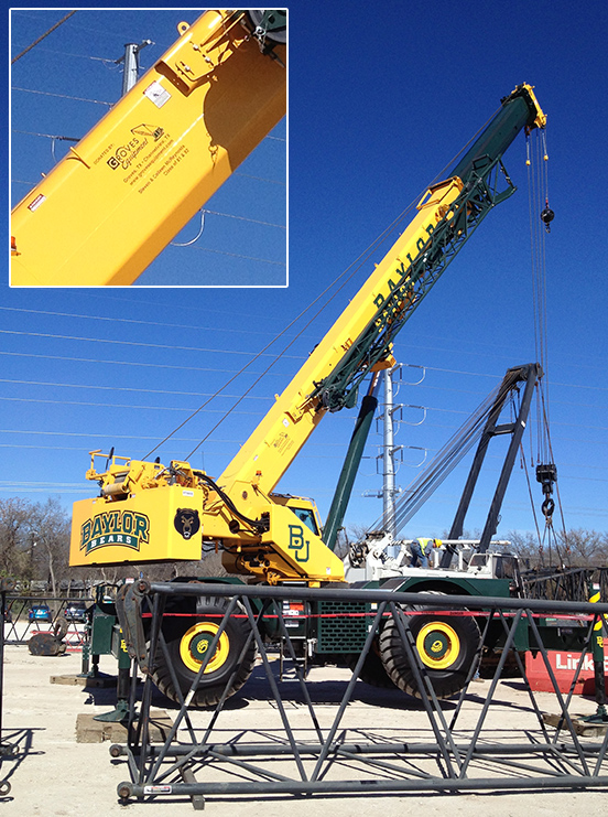 Passers-by on I-35 may have noticed a Baylor-gold crane in the midst of the construction. But the equipment’s Baylor pride doesn’t stop with its color; a closer look reveals Baylor logos on every side, and if you get even closer, you can read the fine print on the crane’s boom. (Click the image to view larger.)