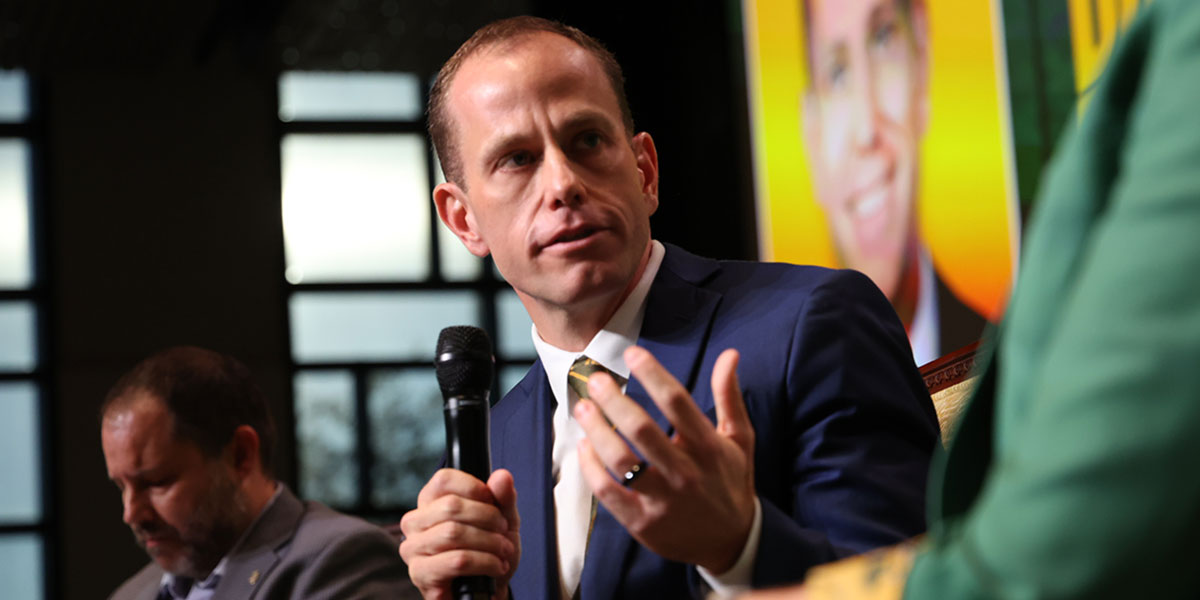 McNamee was officially introduced Monday afternoon before a packed house at the Hurd Welcome Center, complete with a celebratory Dr Pepper Hour, on-stage Q&A with President Linda Livingstone, and media press conference. As he shared his vision for Baylor Athletics amidst the changing college athletics landscape, his diverse experiences and green-and-gold foundation shone through: “I grew up, and Baylor was where I was going… I’m one of y’all.”
